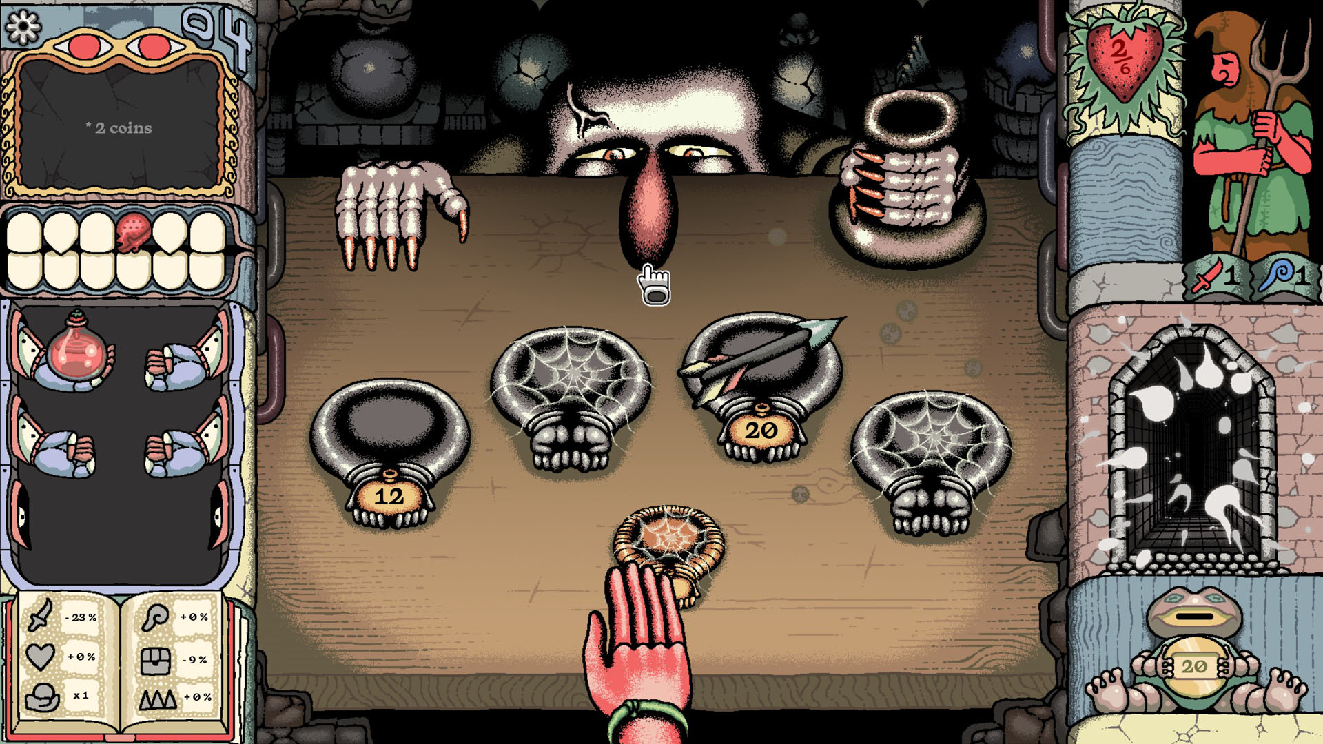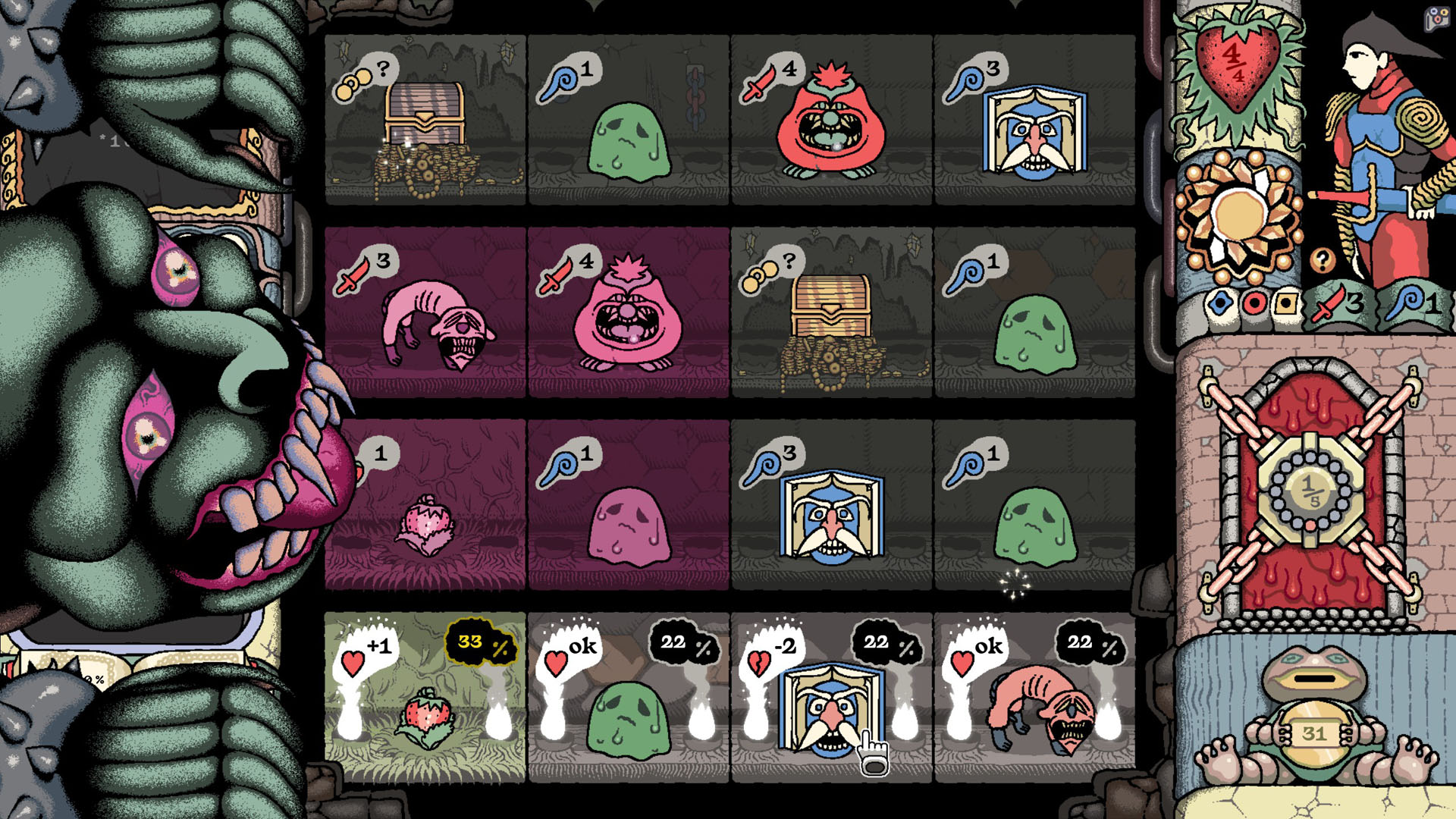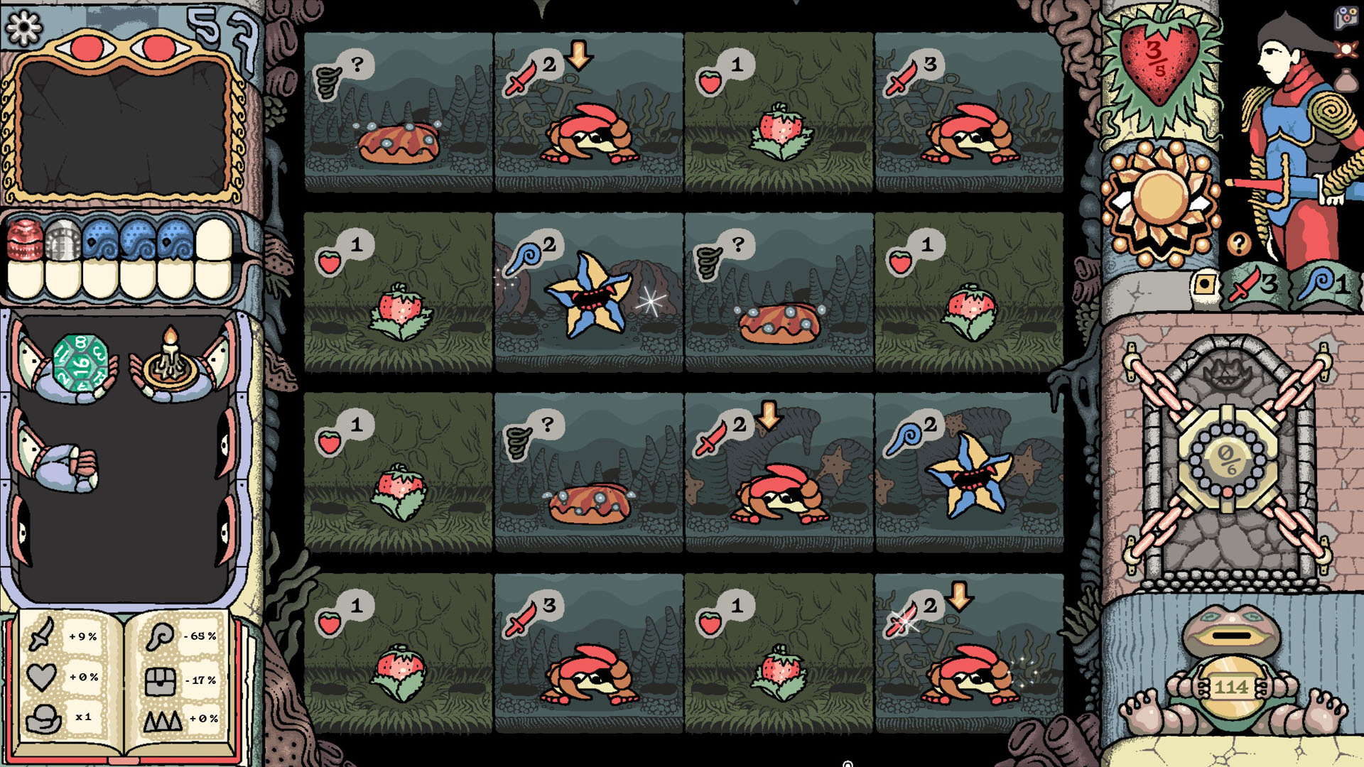 Sol Cesto с точки зрения геймплея — это достаточно простой роуглайт, который маскируется под несколько более сложный роуглайт, используя хитрые уловки, вроде богатого выбора предметов, продающихся в шопе; зубов, которые вы вытаскиваете из тоскливых мосек каменных и металлических истуканов; различных способов немного упростить себя ран через взаимодействия с окружением и многого другого. Но, если проще, то Sol Cesto — это игра вероятностей, где вам надо постоянно принимать решение — рискнуть и получить больше ресурсов, подлечиться, взяв клубничку и т.д. или отправиться уже точно живёхоньким в следующую комнату. Игровой процесс представляет собой переход из комнаты в комнату, где игрока ждут: сетка 4х4 с врагами, ловушками, сундуками и клубничками; торговец; криповый ящер, прямиком из Dorohedoro, который даёт ненужные советы; статуи с диковинными зубами; колодец с котелком для монет; бассейн с артефактами — в общем, вы поняли. Ваша задача дойти до конца — это чуть больше ста комнат, к слову и четыре разных биома. Переходя из комнаты в комнату вы, в основном, будете заниматься именно риск менеджментом и выживанием в условиях беспощадного рандома. К этому надо быть готовым.