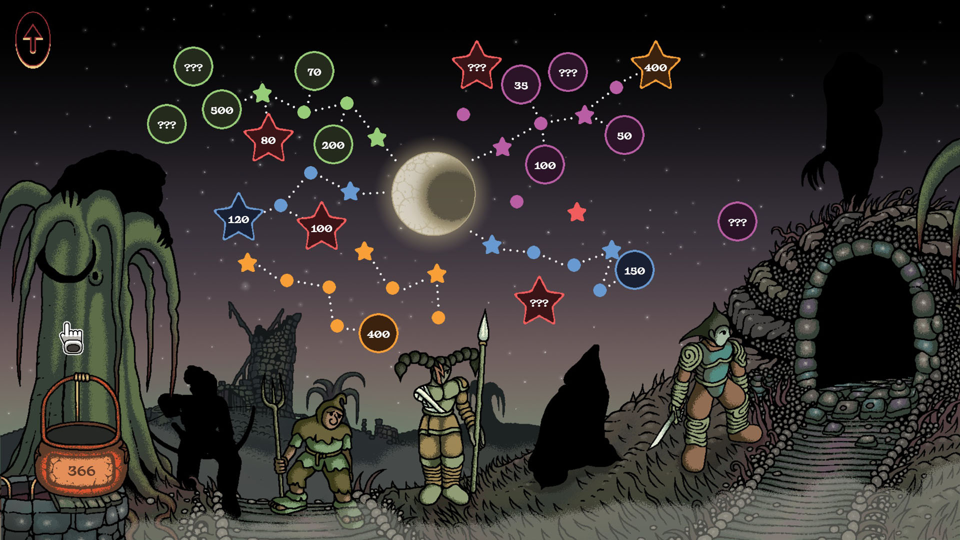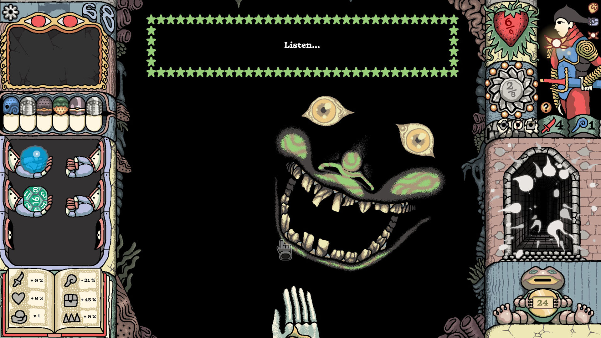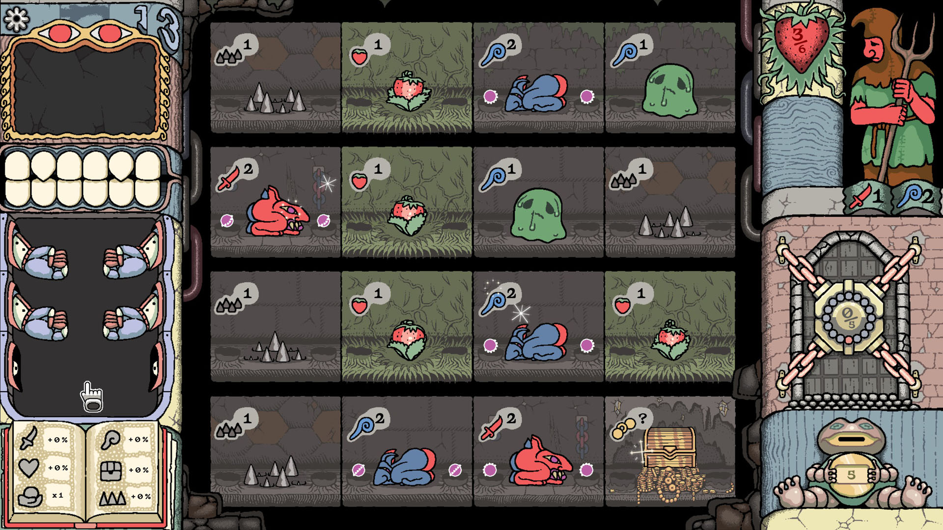 Так вот, в нашей сетке 4х4, как вы понимаете, 16 клеток — в каждой из этих клеток находится либо монстр, либо ловушка, либо что-то полезное. Вы выбираете на какой ряд вы хотите отправить своего персонажа и дальше в работу включается всемогущий бог рандома. Изначально, если вы ещё не набрали полный рот зубов, которые отвечают за ребаланс шансов на попадание на ту или иную клетку, вероятность оказаться на любой из 4 клеток в ряду — 25%. Если вы открыли одну из них и решили опять сходить на тот же ряд — у каждой из трёх будет уже шанс 33%. Само по себе это звучит примерно как игра в однорукого бандита (ощущается, кстати, практически также) с несколькими важными нюансами — Sol Cesto даёт нам возможность шансы корректировать. Например, мы можем вытащить из статуи зуб, который увеличит на 51% шанс попасть на сундук с монетками (а они нам нужны для мета-прогрессии и покупки предметов), но при этом у нас увеличится на 19% шанс попасть на монстров, использующих силу.