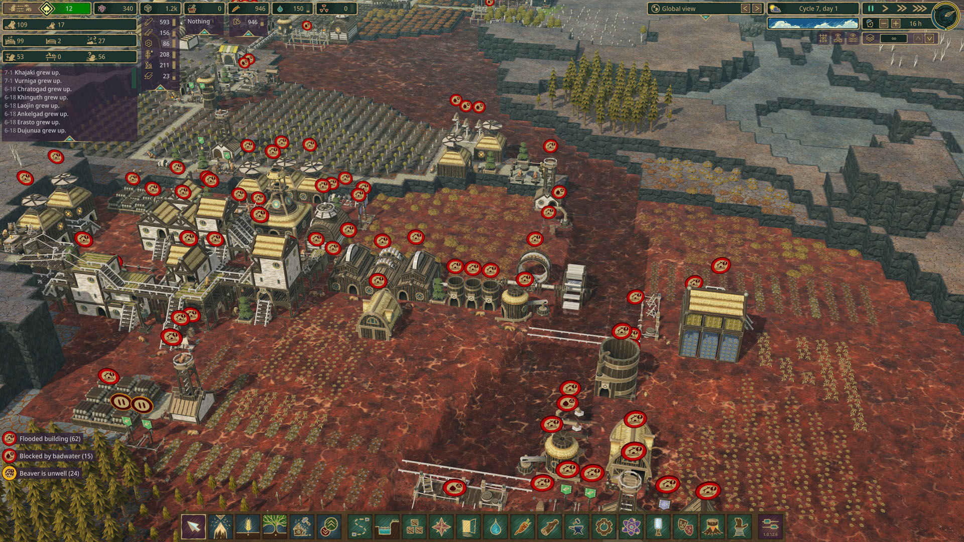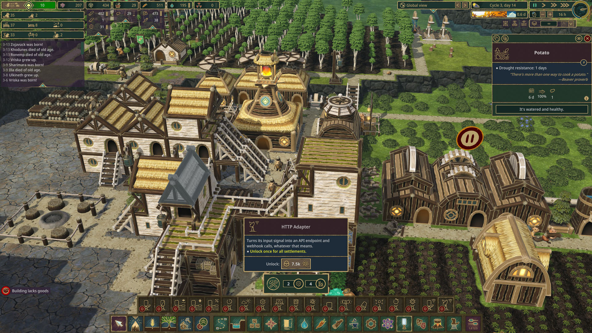 С геймплеем, кажется, разобрались, но что по челленджу? Вообще, в этом плане Timberborn однозначно уходит в категорию игр «развлеки себя сам», потому что какого-то глобального эндгейма или постоянного челленджа в ней нет. Единственное, что происходит без нашего участия — это кризисы, происходящие раз в цикл. Тут либо засуха, где проверяют на прочность ваши запасы воды и системе ирригации (если вы её вообще сделали), либо прилив заражённой воды, которая значительно опаснее засухи — имейте ввиду. И то, и другое первые циклов 5 вообще не проблема — игра даёт отстроиться, понять что к чему. Дальше засухи становятся длиннее, как и приливы. Вот тут начинают появляться интересные задачи — как отвести заражённые воду, чтобы бобры не начинали болеть, а деревья и посевы не умирали? Длительная засуха толкает вас в сторону исследования меню с водными строениями, где есть разного рода насосы и т.д. Работа с рекой вообще одна из самых интересных и сложных задач в Timberborn. И это совершенно логично, ведь бобры и плотины неразлучны. Правда, тут мы строим дамбы, но разница между деревянной дамбой и плотиной не такая уж и существенная. А ещё для выживание вам придётся следить за количеством деревьев, потому что сами они после вырубки (а точнее выгрызки) растут очень медленно. В этом вам помогут лесники, которые сажают деревья (и кусты с ягодами тоже) там, где вам удобно.