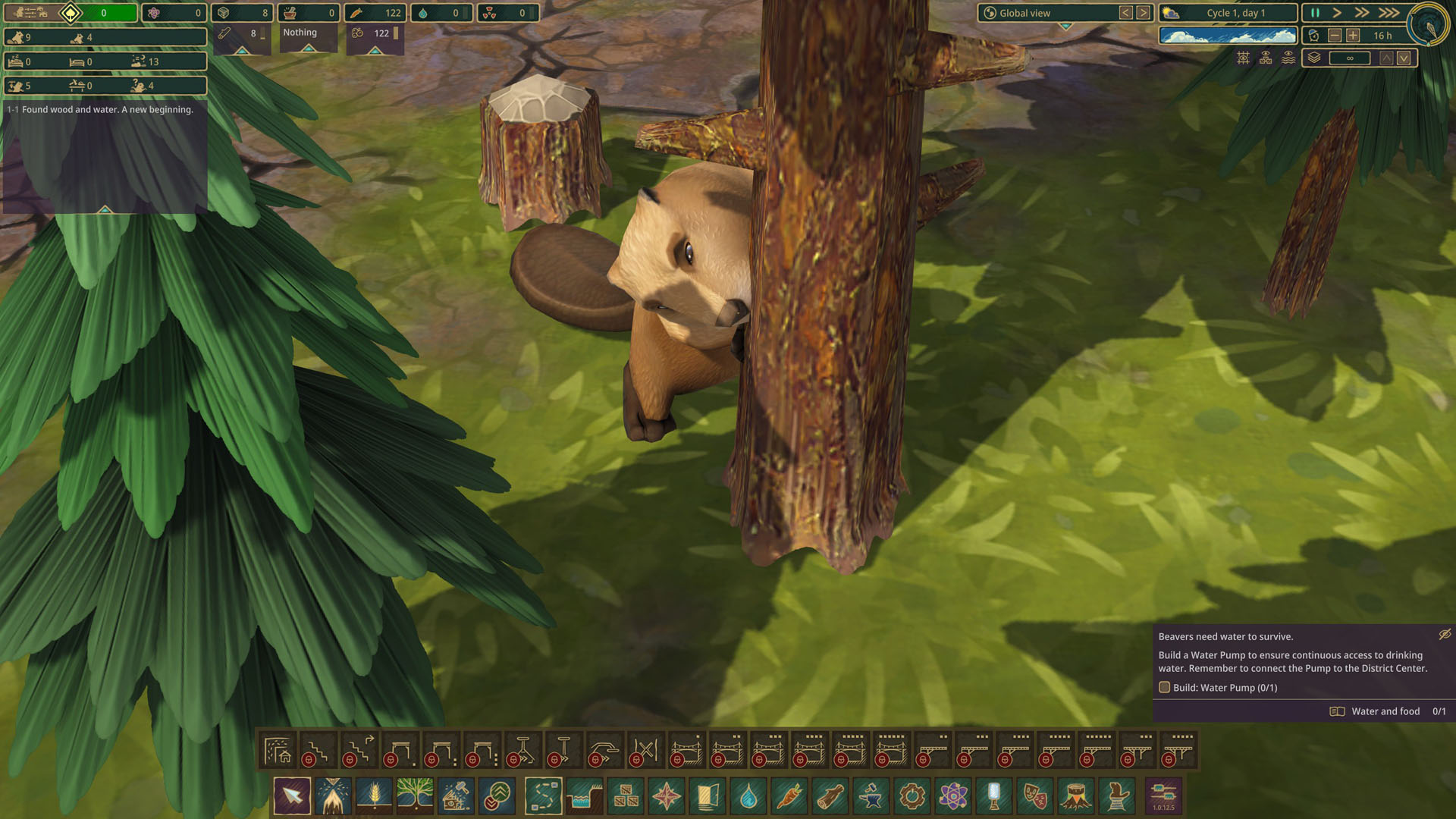 Не делайте удивлённых лиц, но больше всего в Timberborn, конечно, мы будем строить. Из хороших новостей (а это правда неплохая новость) — основной материал для строительства, в общем-то, один — дерево. Для каких-то зданий достаточно обычных бревён, которые бобры спиливают прямо своими острыми зубками, для некоторых нужно делать доски, а есть и те, для которых нужны обработанные доски. В основном же вы будете строить из обычной древесины. В этом плане Timberborn заметно проще многих своих конкурентов в жанре градостроительных стратегий — там мы обычно, как минимум, добываем ещё и камень, какую-нибудь глину, может быть медь или золото. Не говоря уже об играх, вроде Dwarf Fortress, где только базовых ресурсов, скорее всего, больше, чем вообще всех в Timberborn. Проблема ли это? Для меня нет — таким образом игра смещает фокус с бесконечной погони за новыми ресурсами на сам процесс строительства и оптимизации производства. Это ровно то, что я и хочу от таких игр.